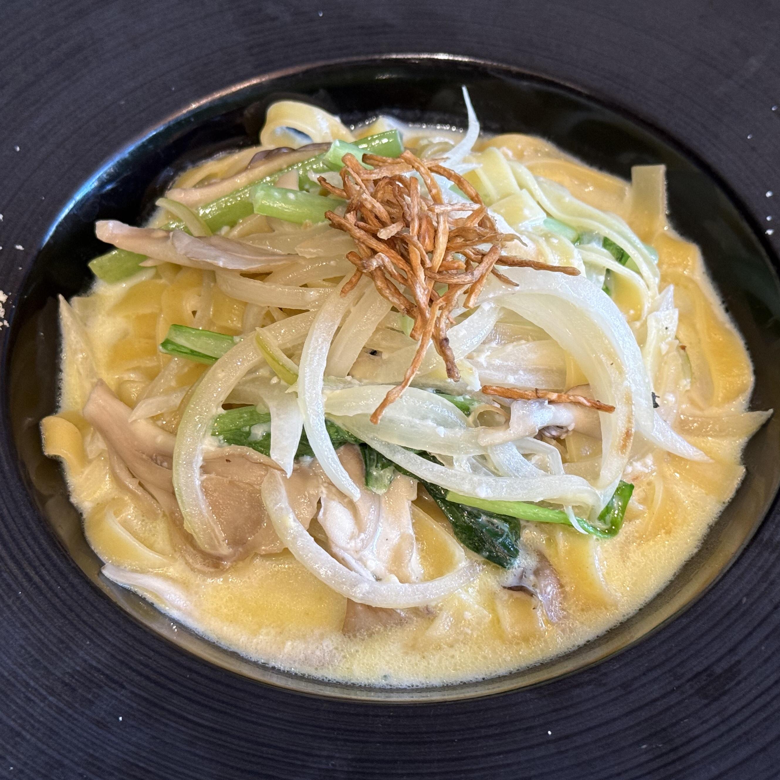 塩麹と豆乳で仕上げた、植物性素材(舞茸・小松菜・玉ねぎ・植物性チーズ)だけのやさしい味わい。